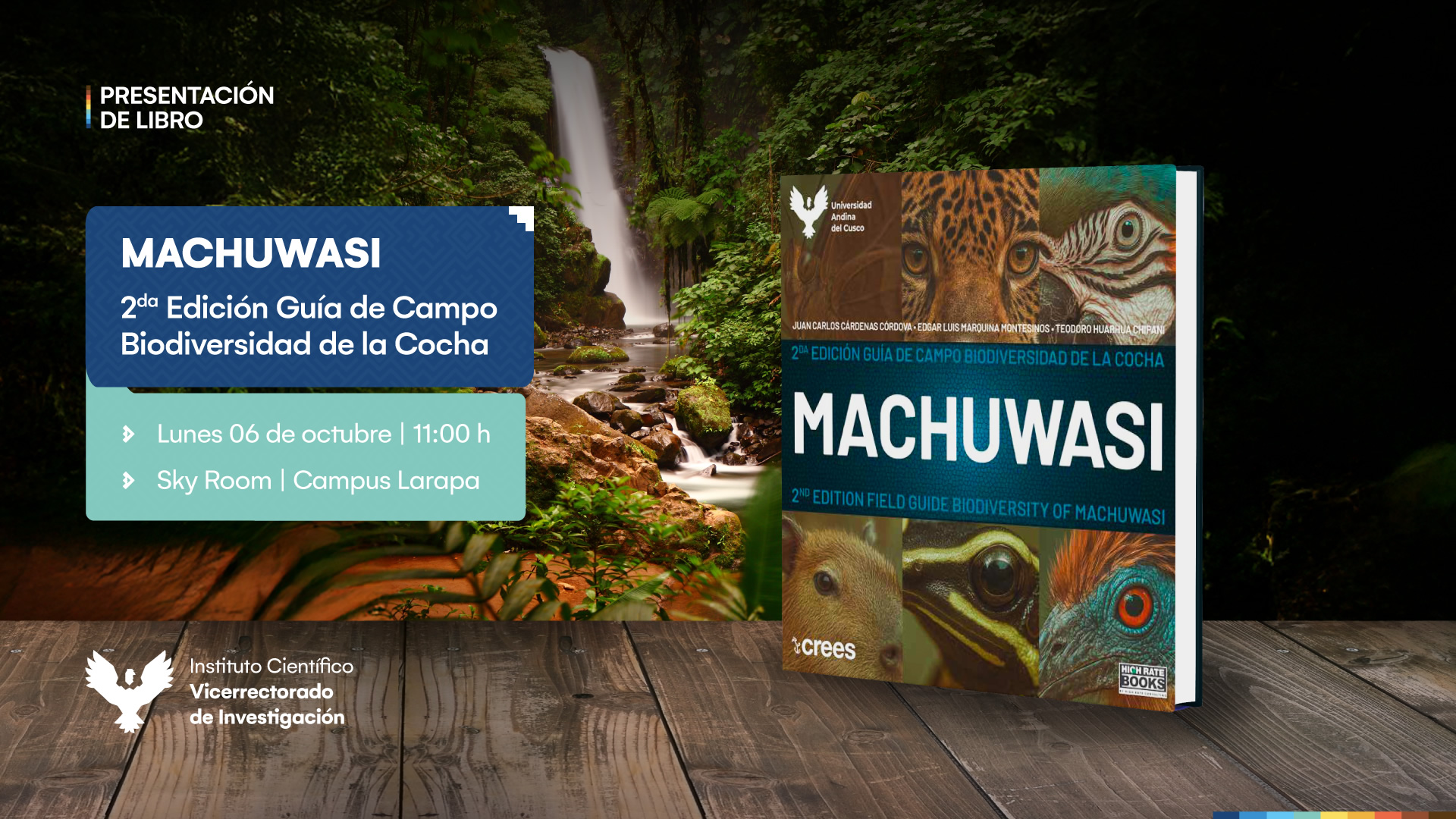 Nos enorgullece presentar la 2da edición del libro “Machuwasi: Guía de campo biodiversidad de la cocha”, una obra que pone en valor la riqueza natural de la Cocha Machuwasi, ubicada en Villa Salvación, Provincia del Manu. Constituye un aporte esencial para la investigación, la enseñanza y la conservación de la biodiversidad.